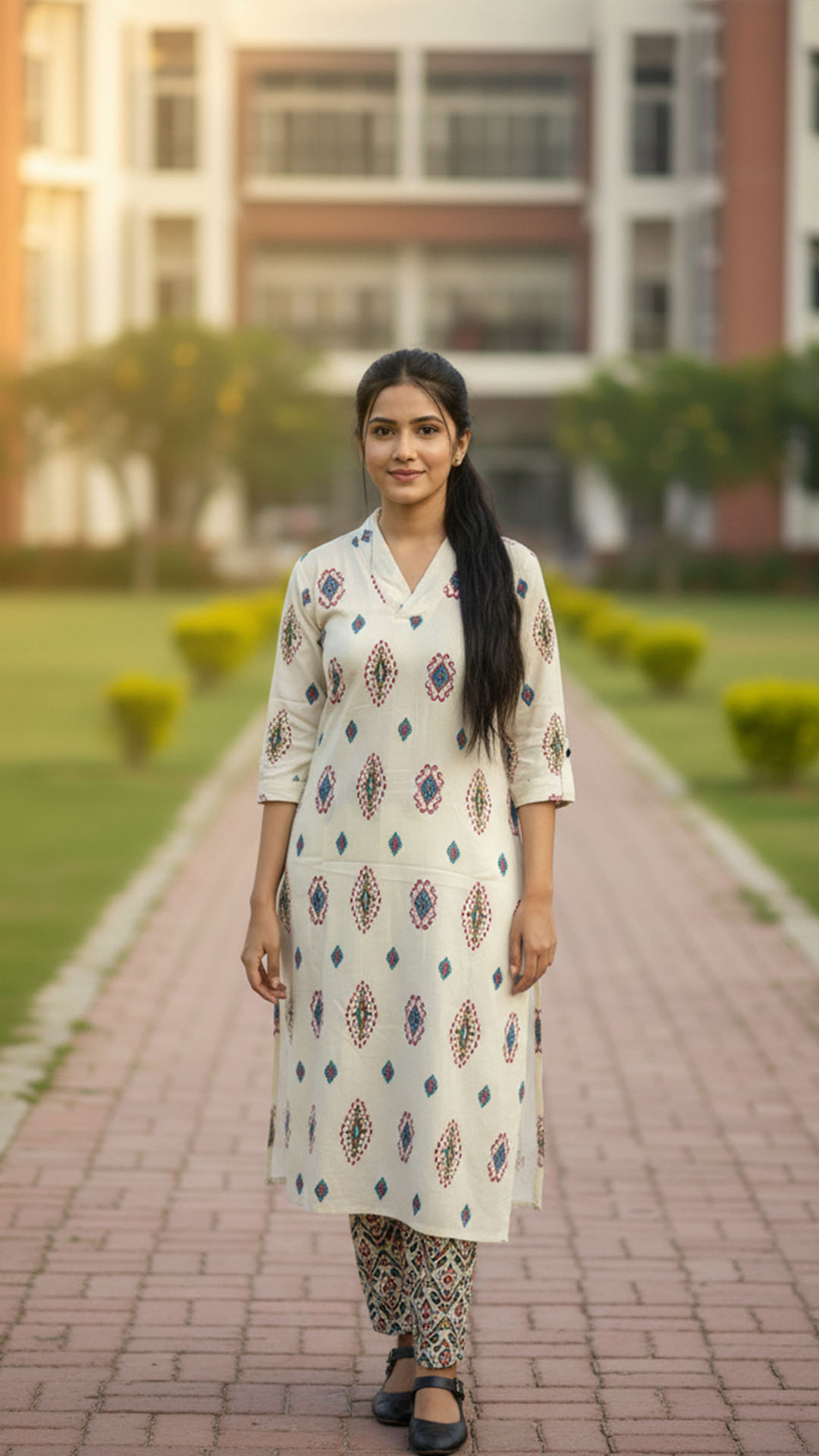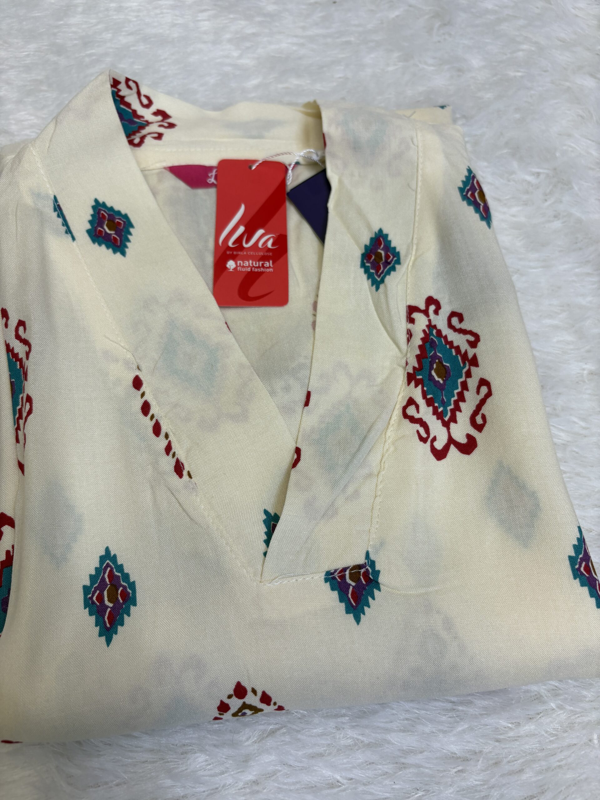 Step into effortless elegance with this Cream Ikat Printed Rayon Kurti from DivineDhaga. Designed in soft and breathable rayon, it ensures all-day comfort while giving a neat and polished look. The ikat-inspired multicolour motifs on the cream base add a chic ethnic charm. The V-notch neckline and 3/4th sleeves make it perfect for work, travel, college, and everyday wear. Pair it with leggings, pants, or denim for a versatile and graceful look.