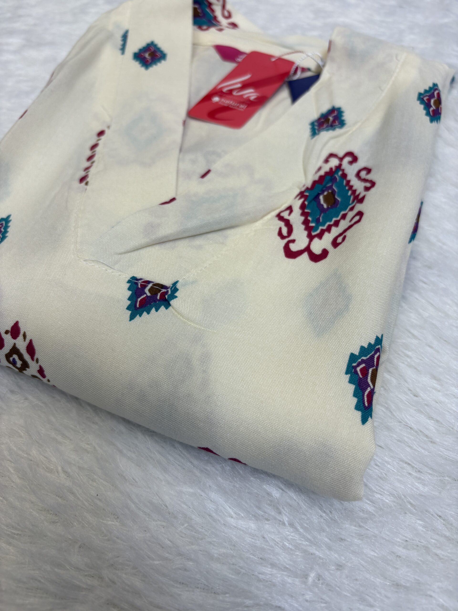 Be the first to review “A Cream Ikat Printed Soft Rayon Kurti” Cancel reply