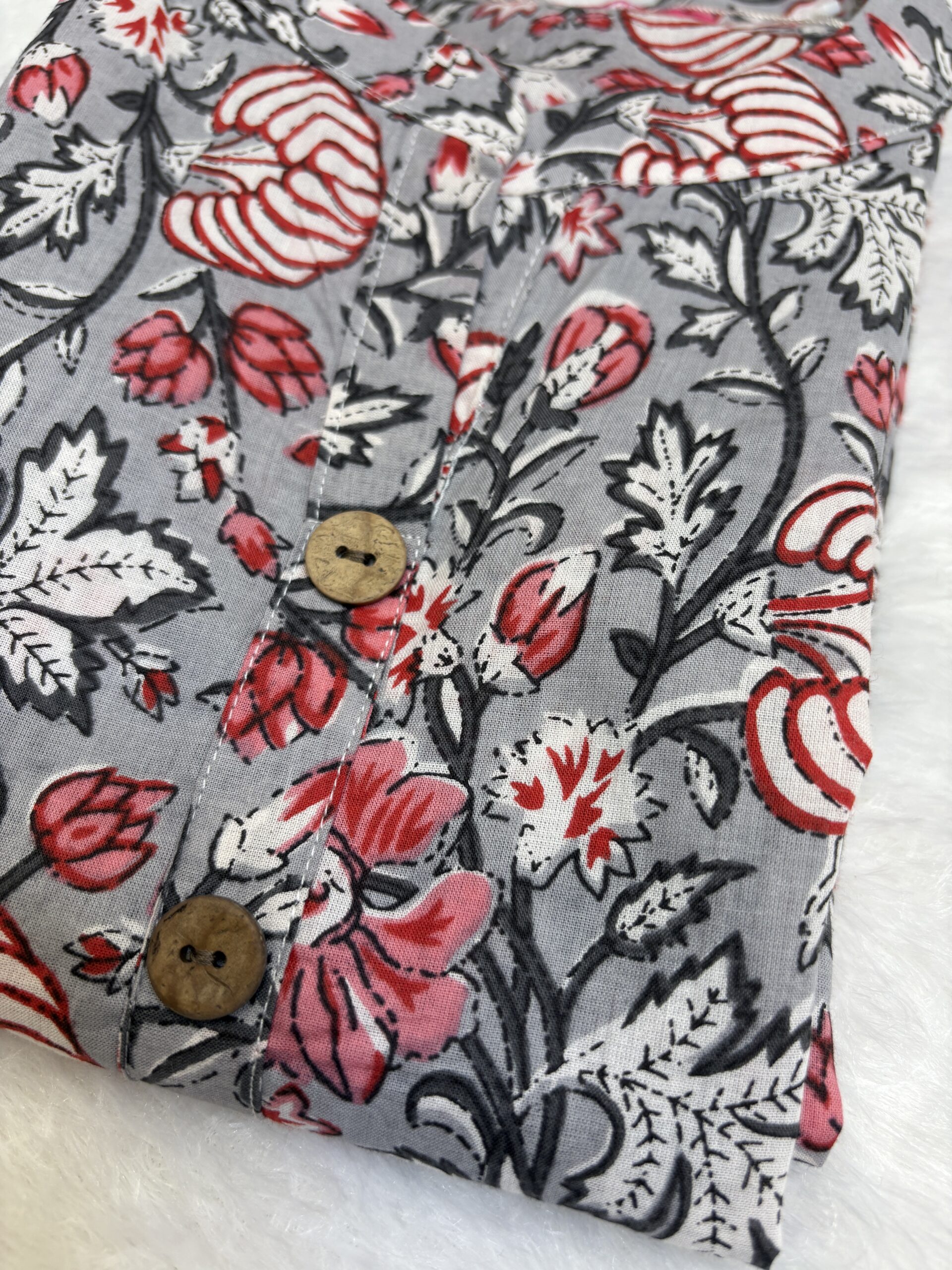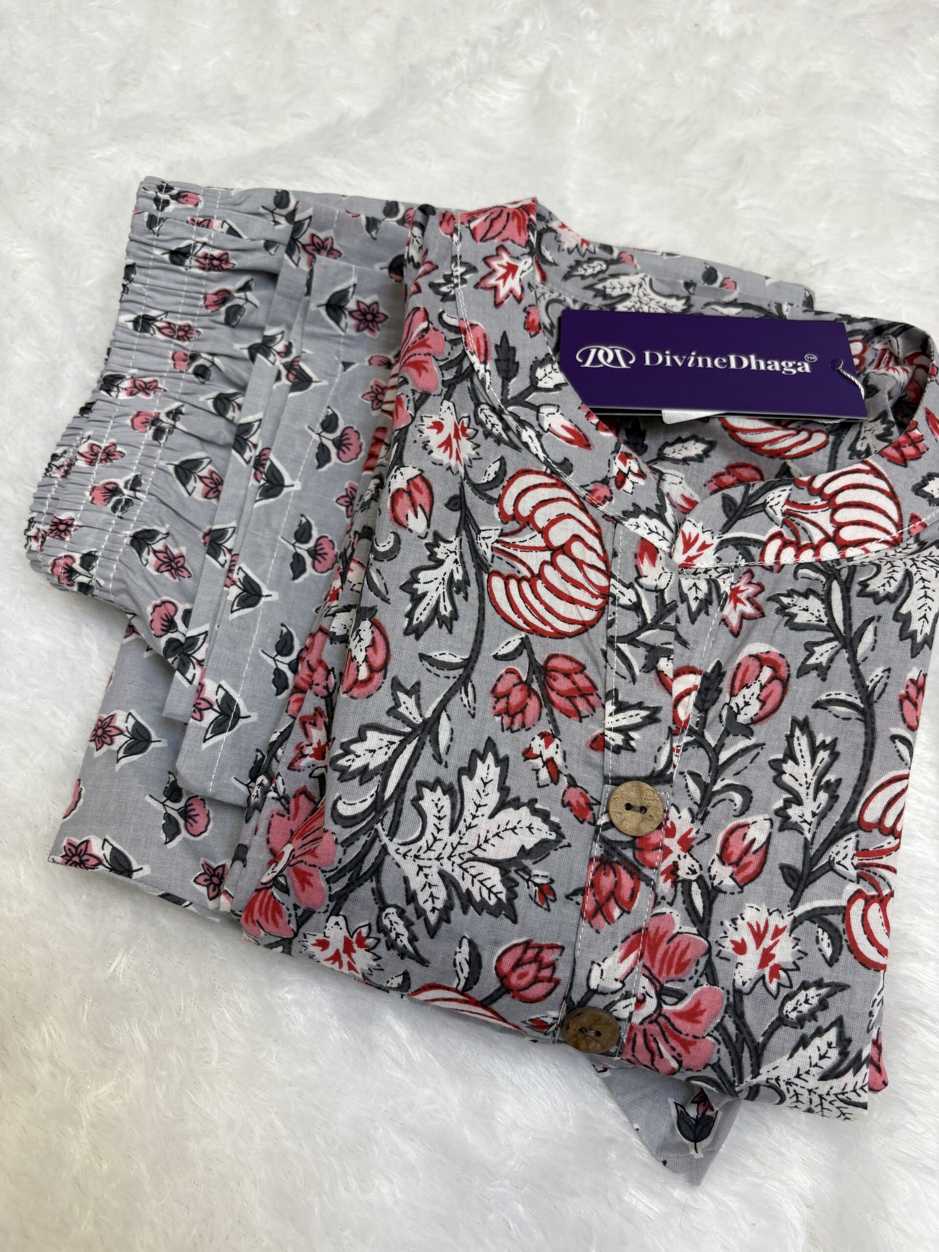 The top features a relaxed fit with a classic button-down front, highlighted by elegant floral prints in red, white, and black over a subtle grey base. Paired with matching elasticated pants, this co-ord set offers ease of movement and a naturally stylish look. Ideal for daily wear, work-from-home days, casual outings, or relaxed evenings, this set blends comfort with effortless style.