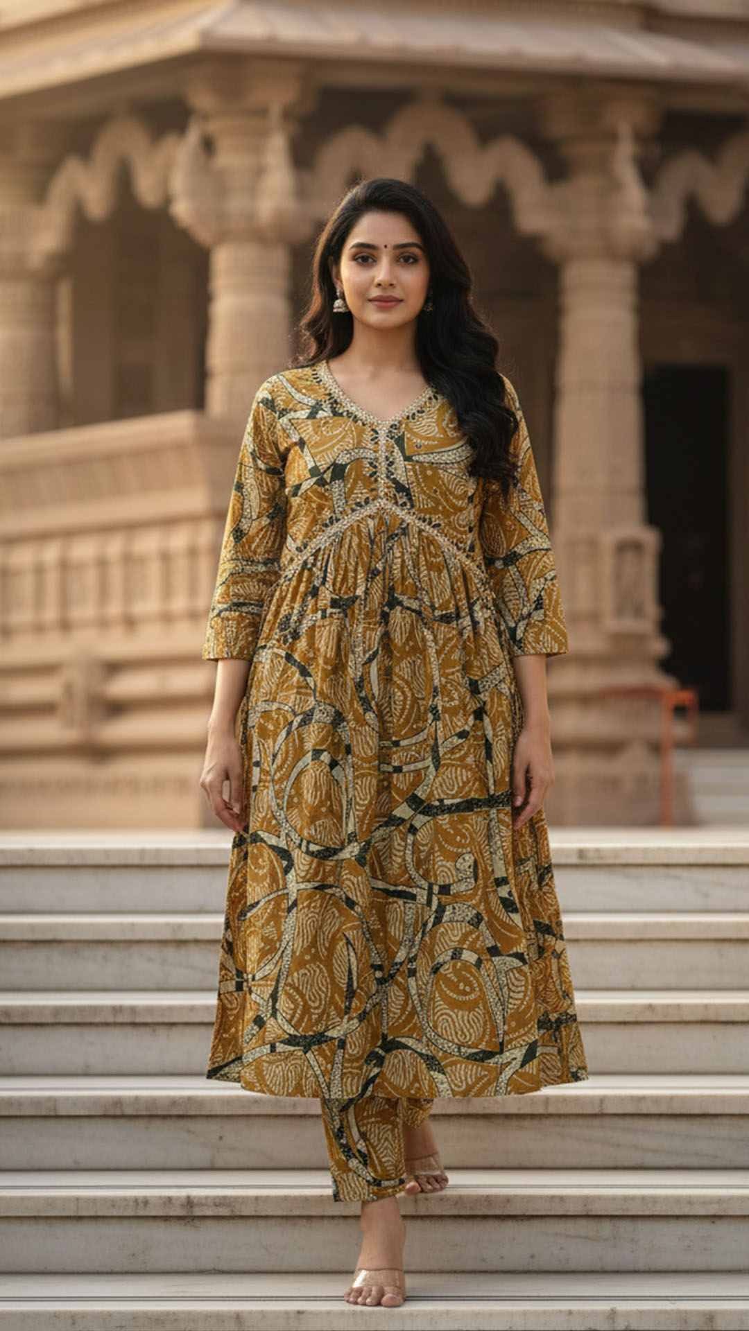 Step into effortless elegance with this mustard printed A-line kurti from DivineDhaga. Designed in 100% soft cotton, it features a beautiful multicolour abstract floral print that blends modern style with everyday comfort. The kurti comes with delicate neck embroidery work highlighted with sequins that adds a touch of festive charm without compromising on simplicity. The A-line silhouette provides a flattering fit, while the tie-ups at the waist enhance the shape and comfort. Perfect for daily wear, office wear, and casual outings, this kurti keeps you comfortable throughout the day.