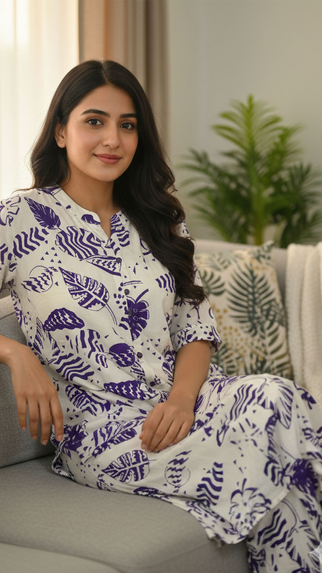 The straight-fit kurti comes with a front button placket and three-quarter sleeves, offering a relaxed yet polished look suitable for daily wear. Paired with matching comfortable pants, this set is perfect for long workdays, casual outings, or relaxed travel plans. Lightweight, flowy, and gentle on the skin, it keeps you comfortable throughout the day while maintaining a modern aesthetic.