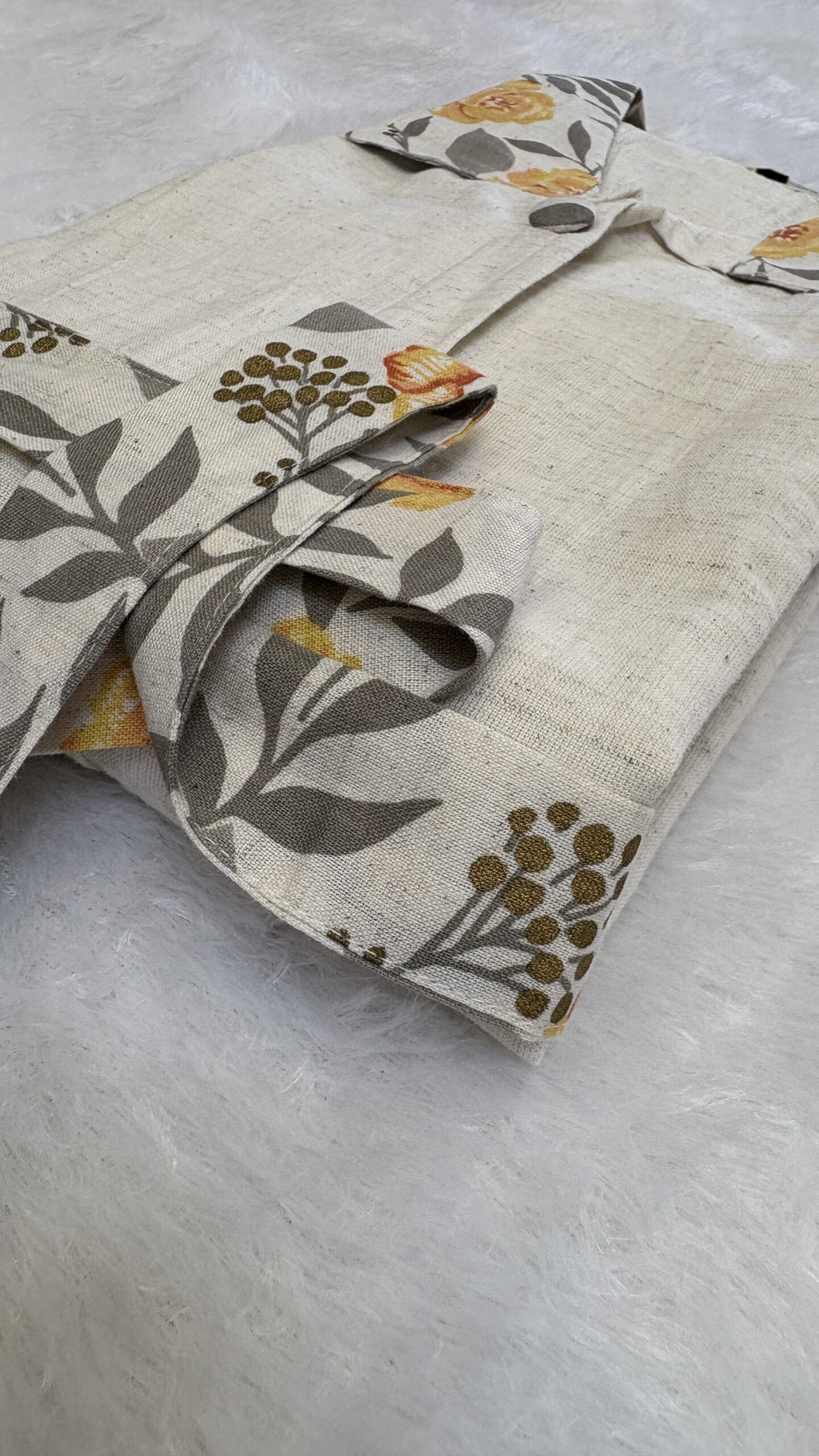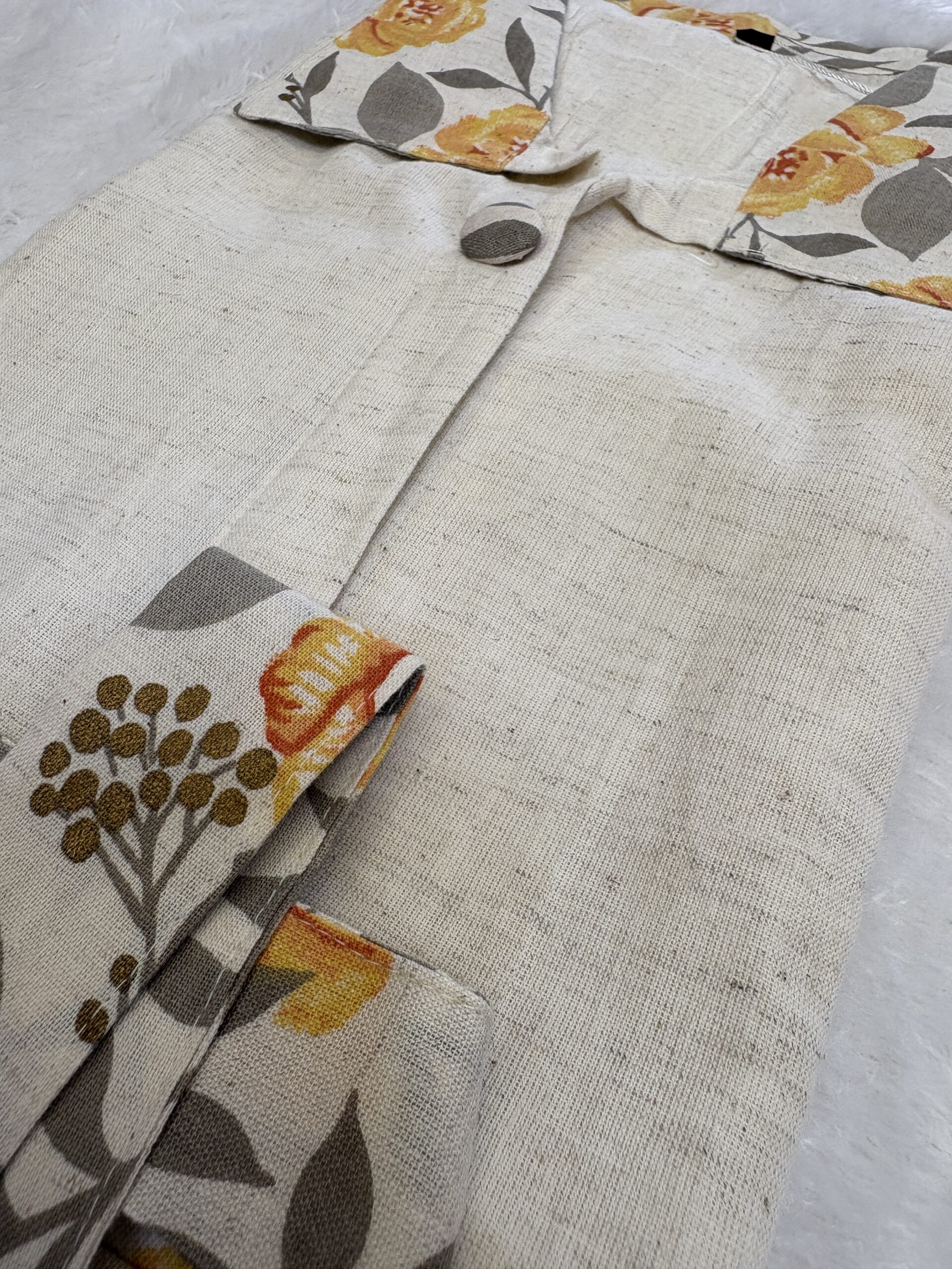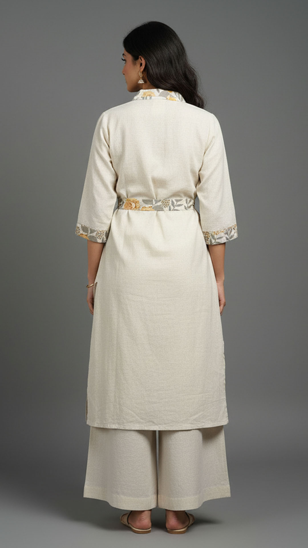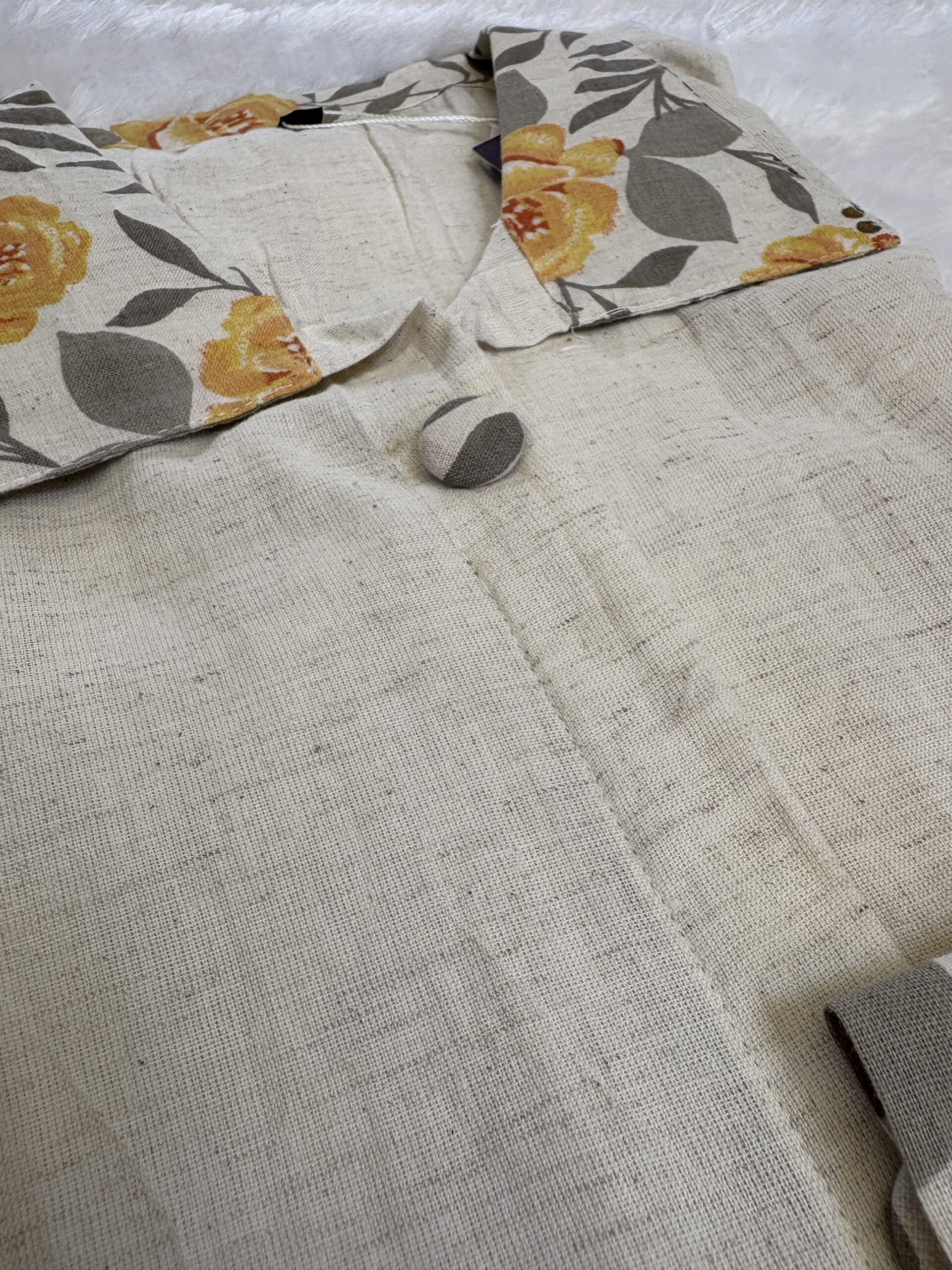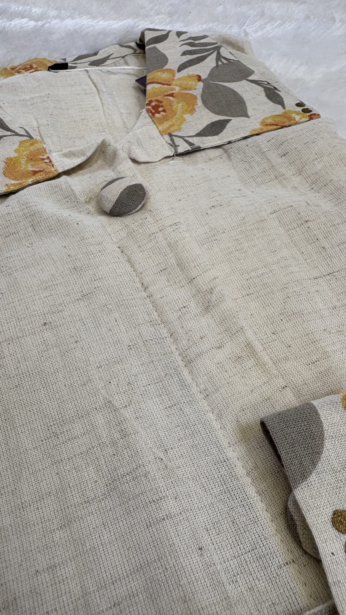 Elevate your everyday look with this elegant beige shirt-style kurti crafted from a premium cotton-linen blend. The fabric features a natural textured weave that gives it a sophisticated, earthy finish while ensuring breathability and all-day comfort. The design is beautifully complemented by floral printed detailing on the collar, sleeve cuffs, and a matching waist belt—adding a refreshing pop of mustard and grey tones.