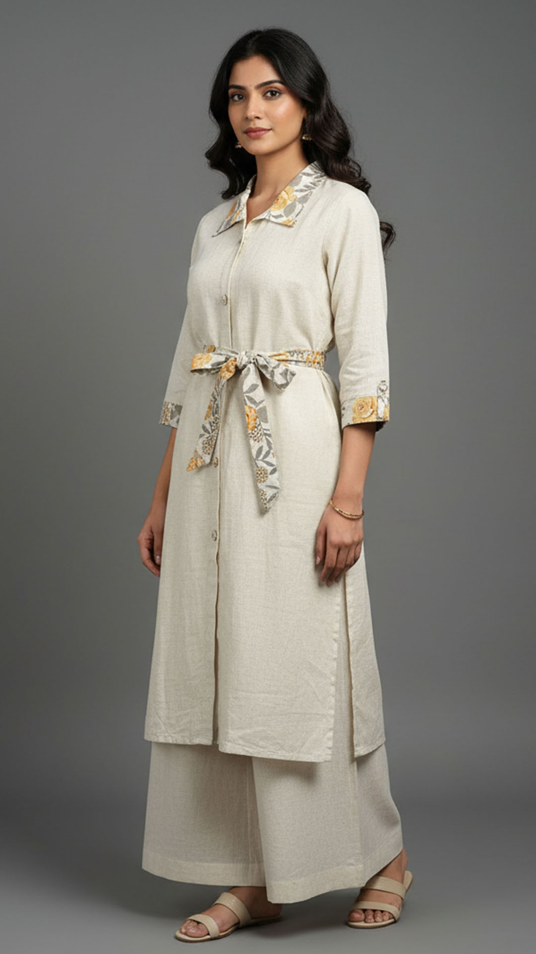 Beige Cotton-Linen Blend Shirt Kurti with Floral Detail & Tie-BeltBeige Cotton-Linen Blend Shirt Kurti with Floral Detail & Tie-Belt