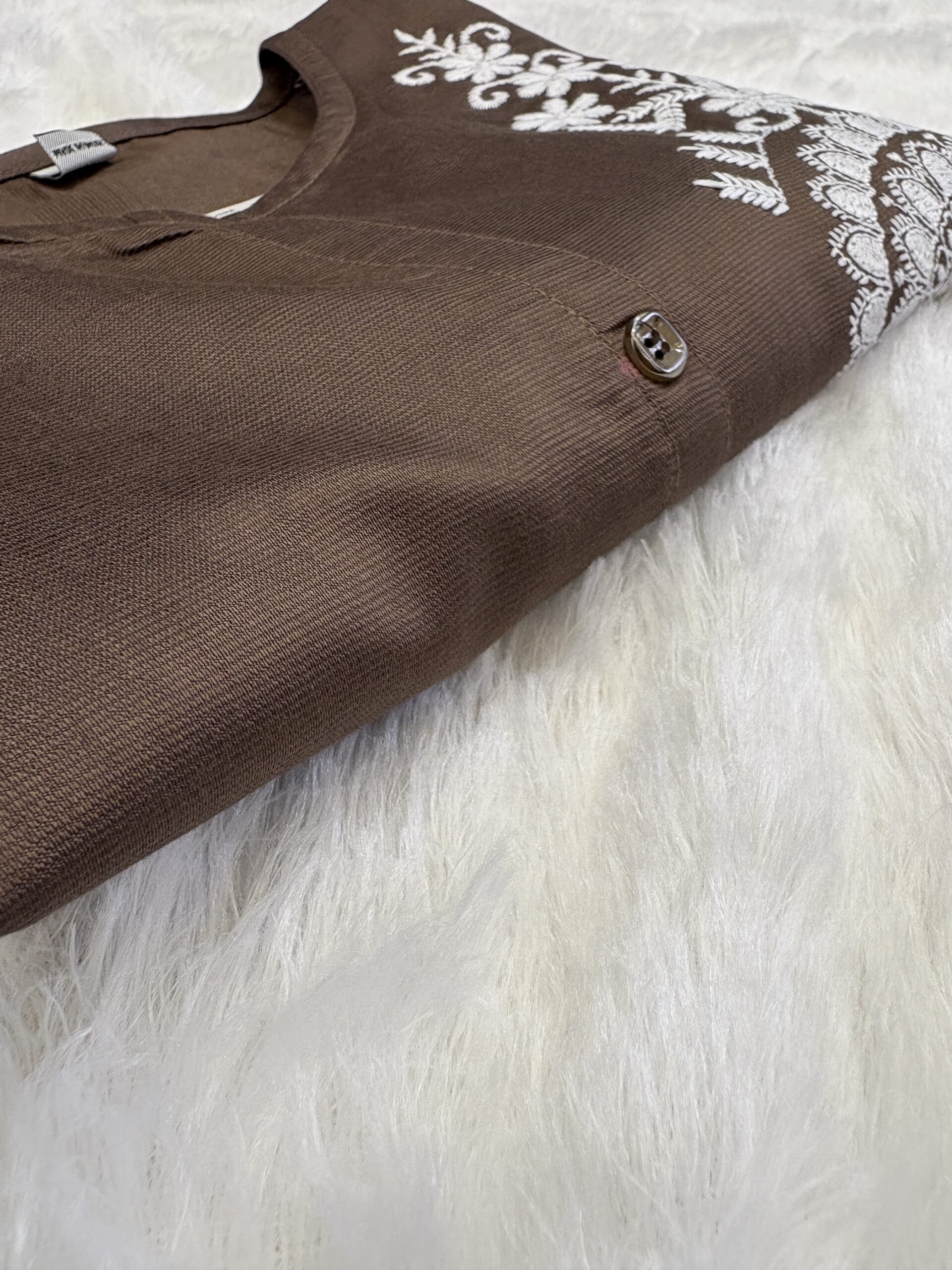 Elevate your wardrobe with this Chocolate Brown Front-Open Embroidered Kurti, crafted from a premium textured rayon fabric that offers a smooth feel and a graceful fall. The rich brown shade is beautifully complemented by intricate white thread embroidery placed along the front and side, creating a sophisticated ethnic look perfect for office wear, festive gatherings, or refined everyday style.