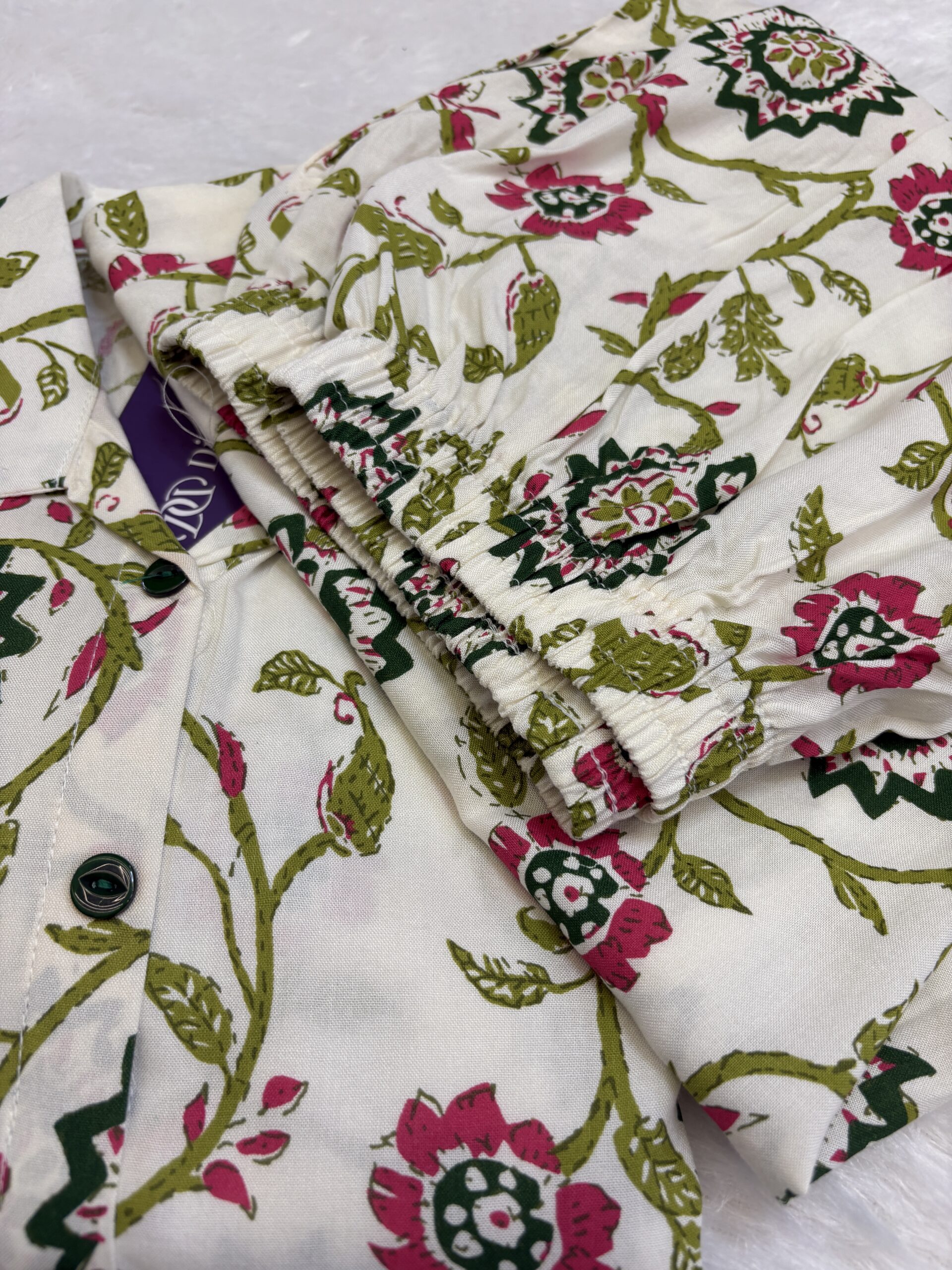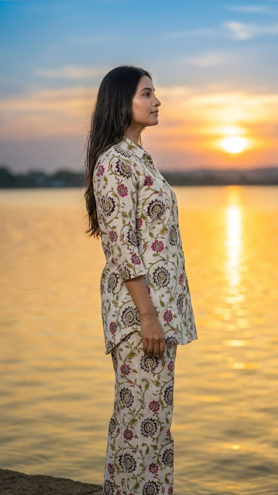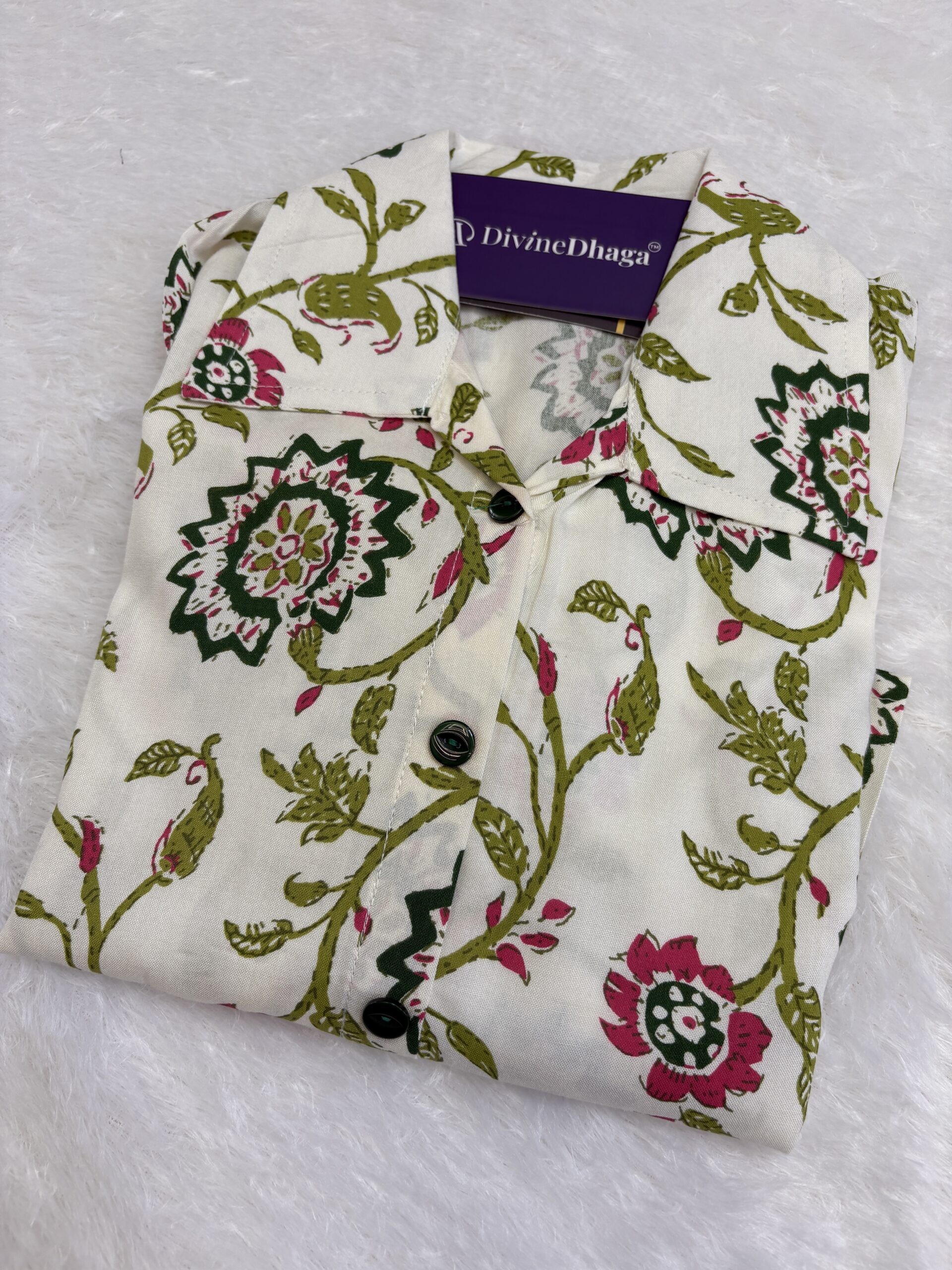 This elegant cotton co-ord set features a beautifully printed floral shirt paired with matching bottoms, designed for effortless everyday styling. Crafted in breathable cotton fabric, the set offers all-day comfort while the soft cream base with green and pink floral motifs adds a refreshing, feminine touch. The button-down shirt silhouette ensures ease of wear, making it suitable for workdays, casual outings, or relaxed travel looks. A versatile co-ord that blends comfort, simplicity, and modern Indian aesthetics.