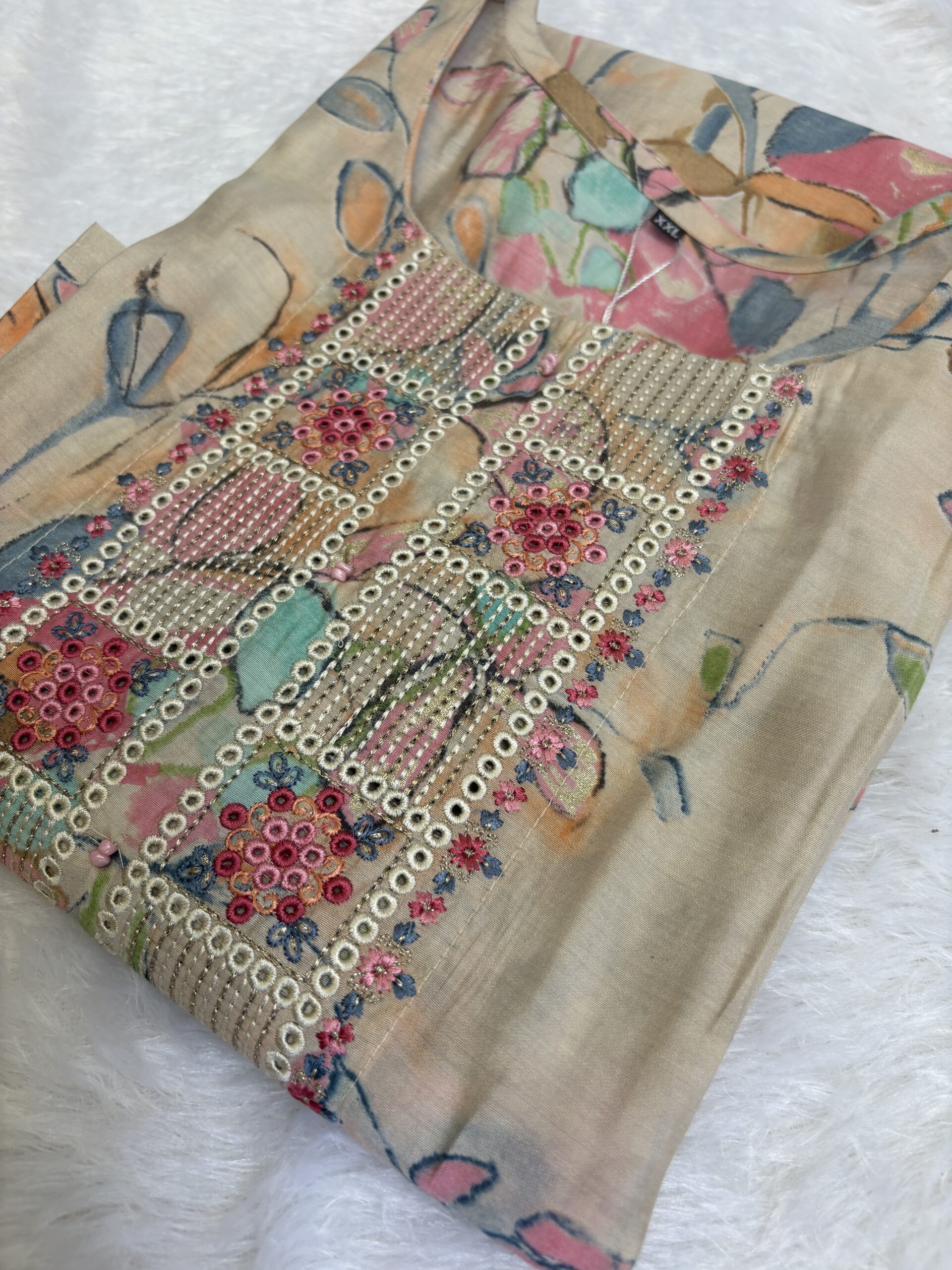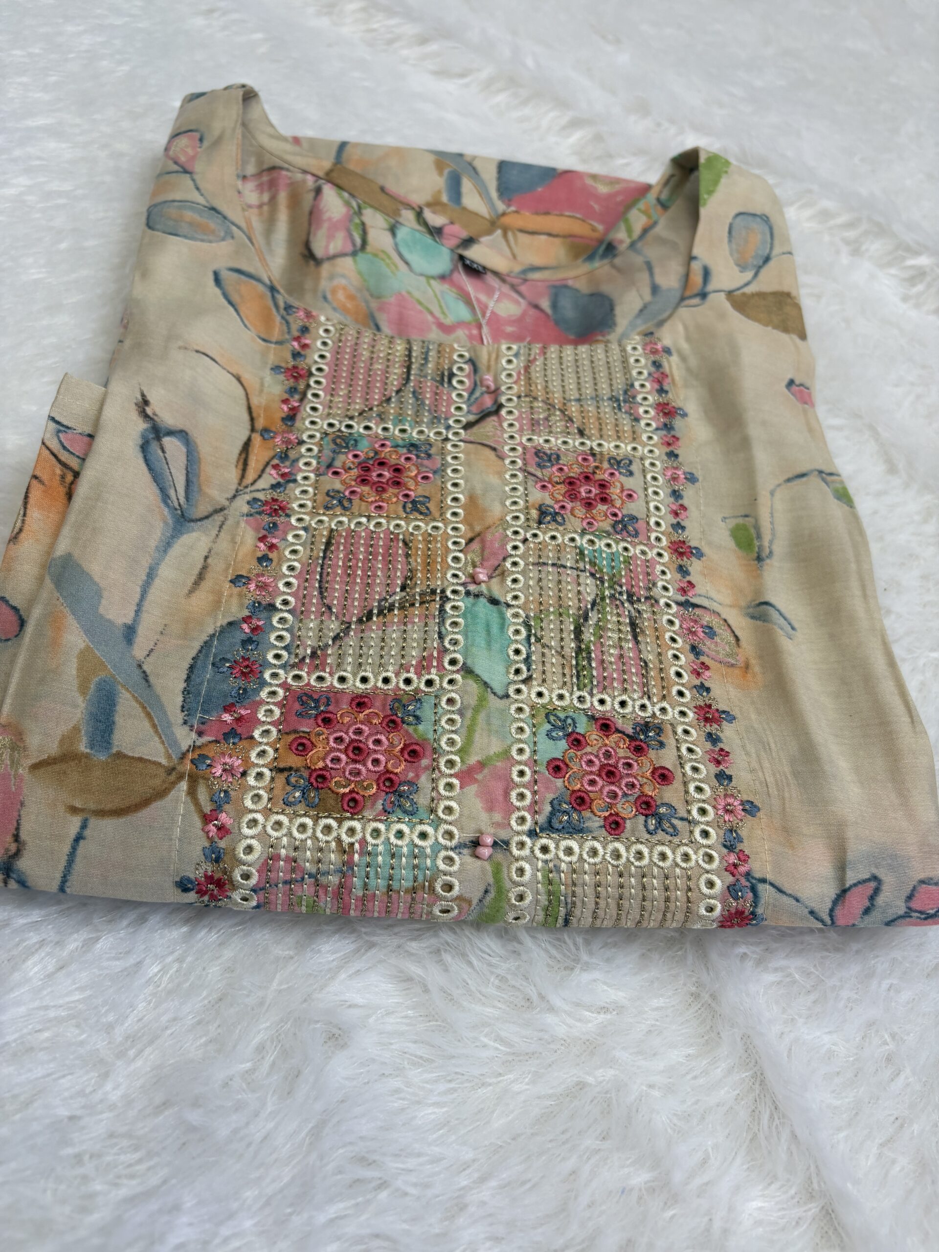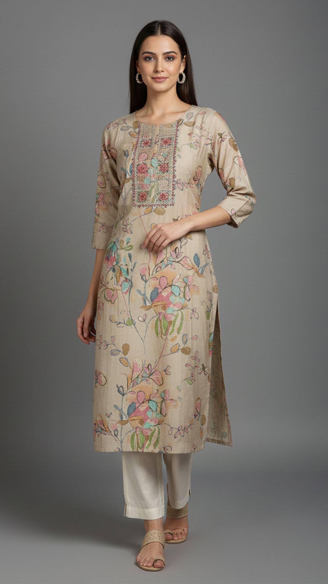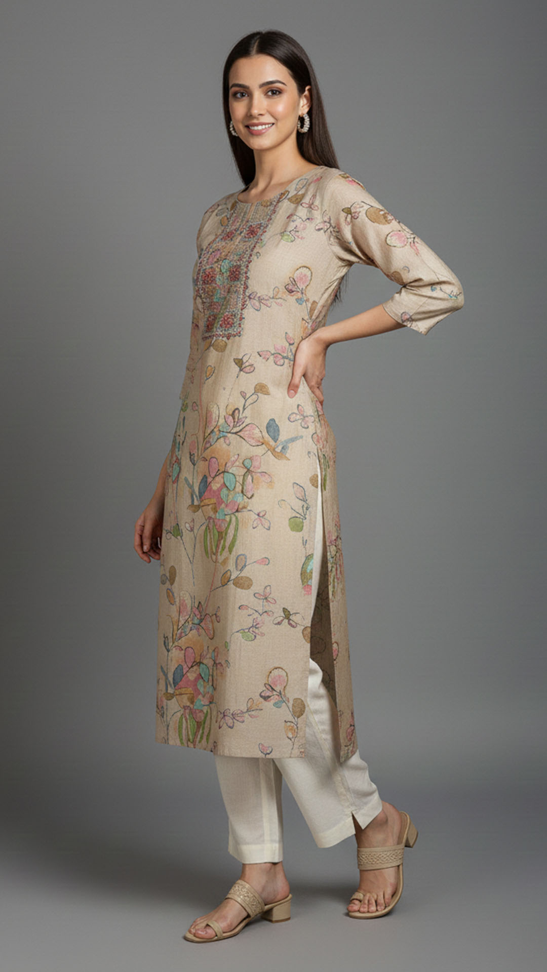 This beige multicolor floral printed kurti blends softness, elegance, and intricate craftsmanship in one beautiful design. Crafted from premium soft rayon, it features a delicately embroidered square neckline enriched with multicolored threadwork, pearls, and eyelet lace detailing. The pastel floral print enhances the kurti’s feminine appeal, making it perfect for daily comfort as well as casual outings. With 3/4th sleeves and a breathable fabric feel, this kurti ensures all-day ease while keeping your style effortlessly graceful.