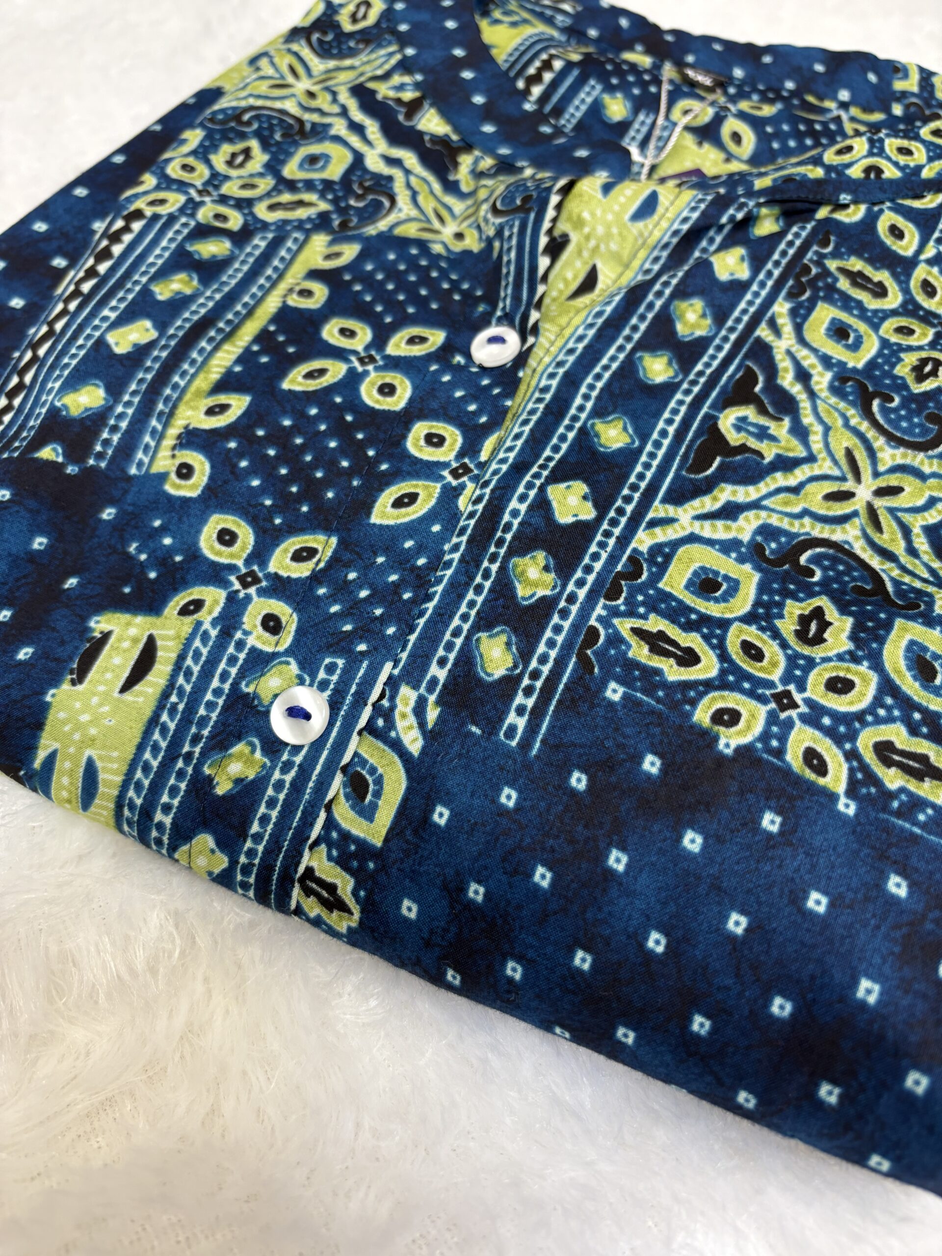 Colour: Indigo blue with olive & yellow accents