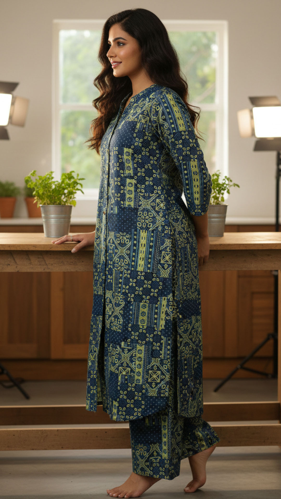 A statement two-piece set featuring rich indigo tones with geometric mosaic prints. Crafted in a soft, breathable rayon blend, this set offers all-day comfort with an effortlessly stylish look.