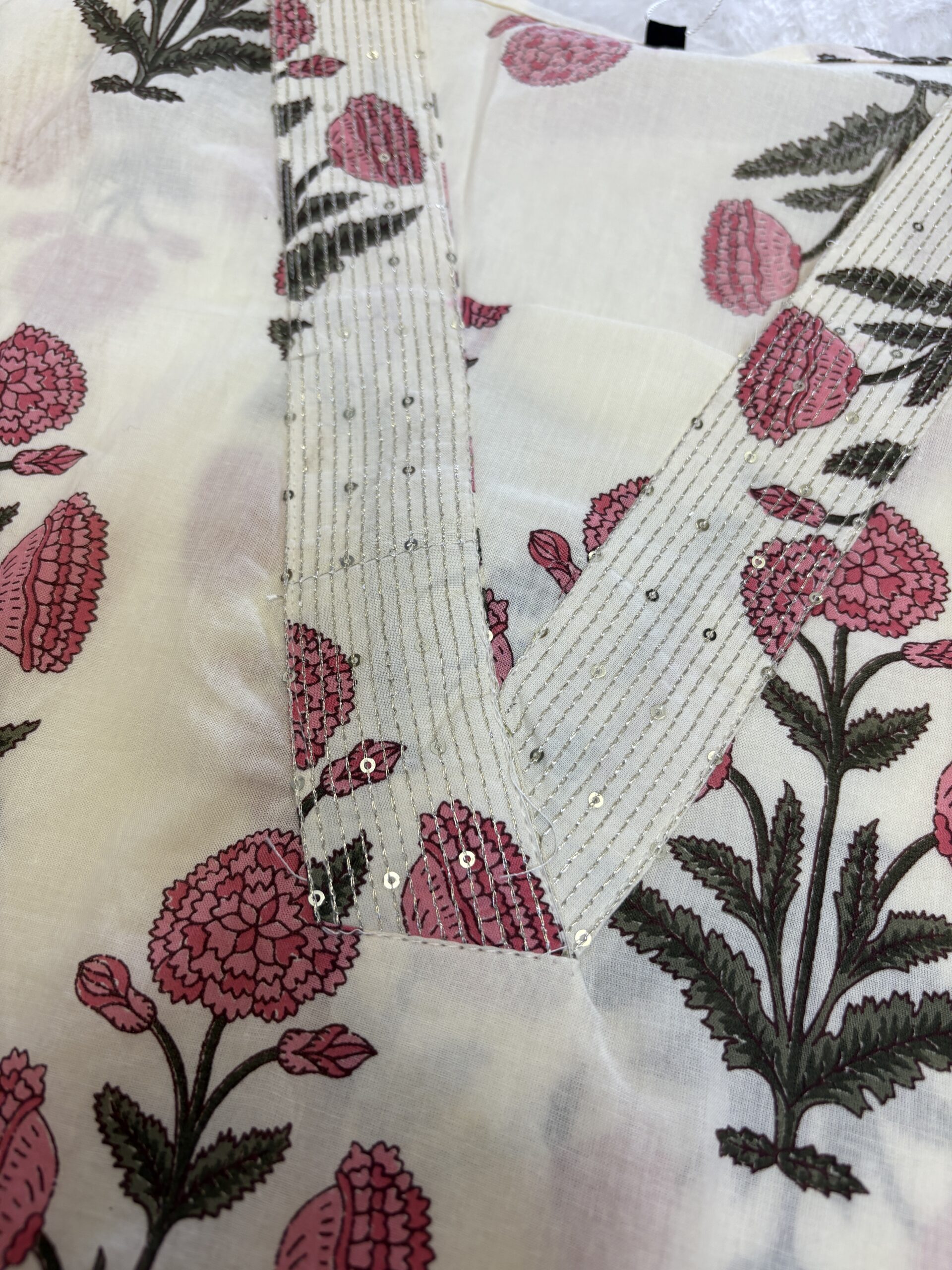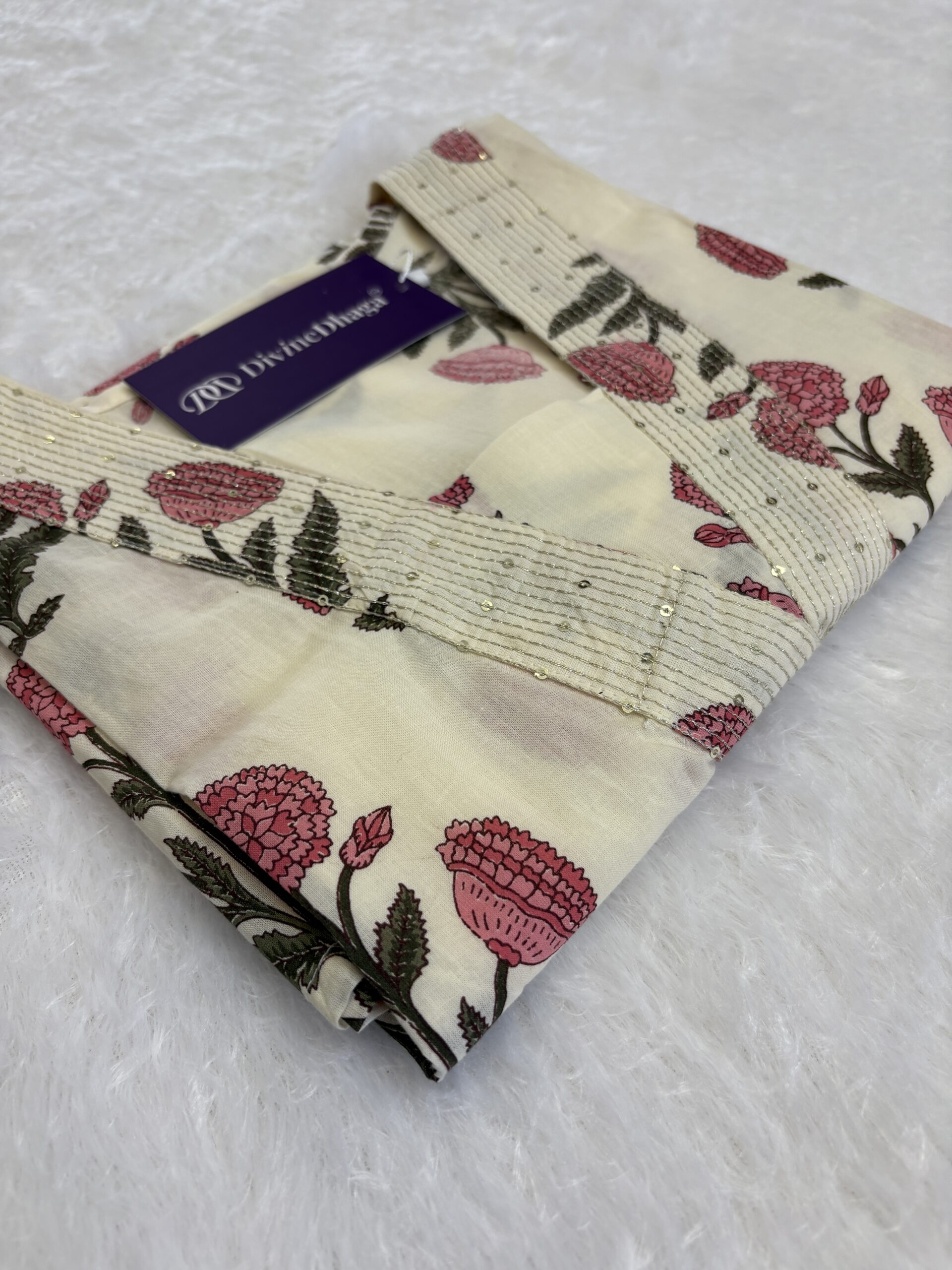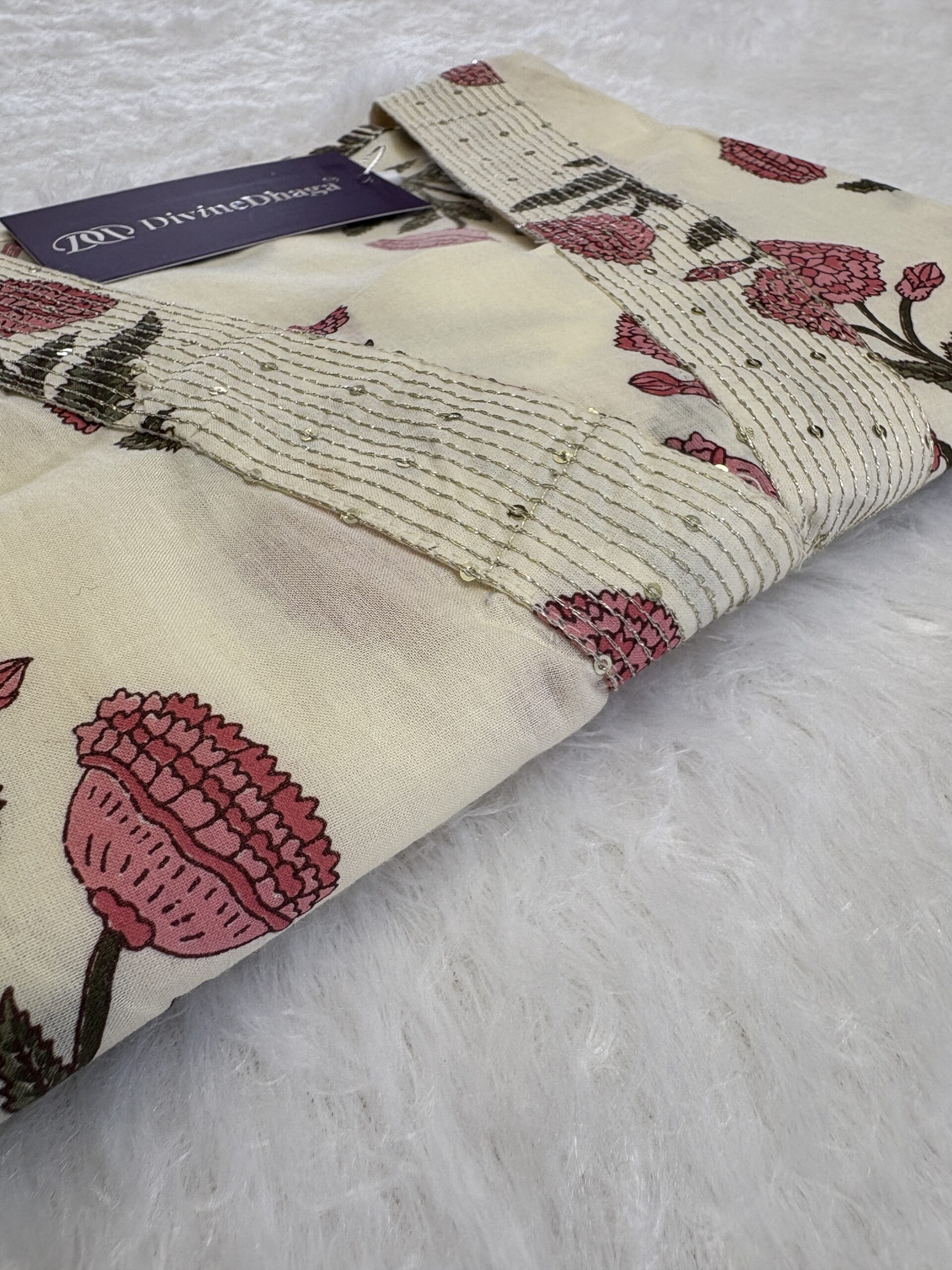 Elevate your everyday elegance with this stunning DivineDhaga kurti featuring a soothing ivory base adorned with beautiful pink floral prints. The neckline is enhanced with fine sequin hand-work detailing, adding a subtle festive sparkle while maintaining a soft and graceful look. Crafted from breathable and lightweight fabric, this kurti ensures all-day comfort—perfect for warm weather and daily styling. The straight-cut silhouette and 3/4th sleeves make it ideal for office, casual outings, travel and festive lunches. Style it with matching pants or denim to create an effortlessly chic look.