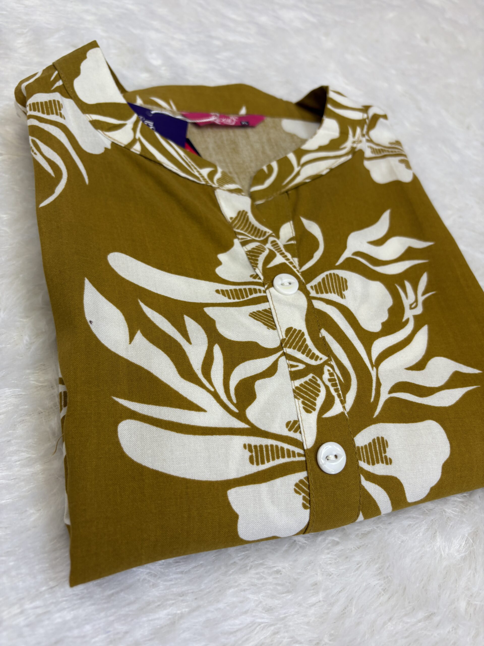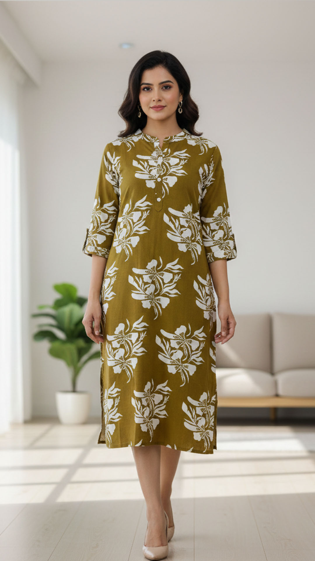 Refresh your everyday wardrobe with this elegant mustard yellow floral cotton kurti. Crafted from 100% breathable cotton, it ensures all-day comfort while keeping you stylish for office, travel, and casual outings.