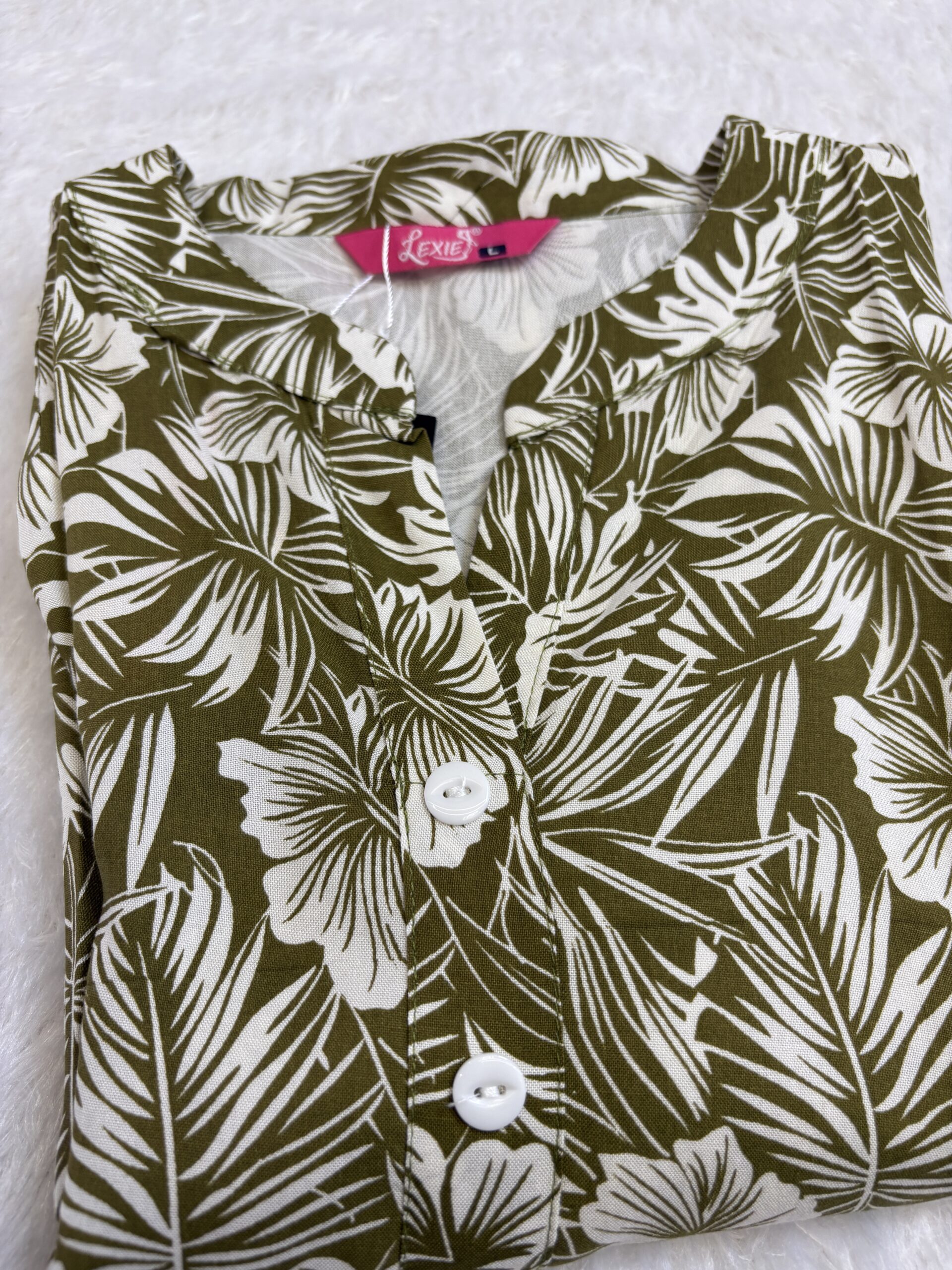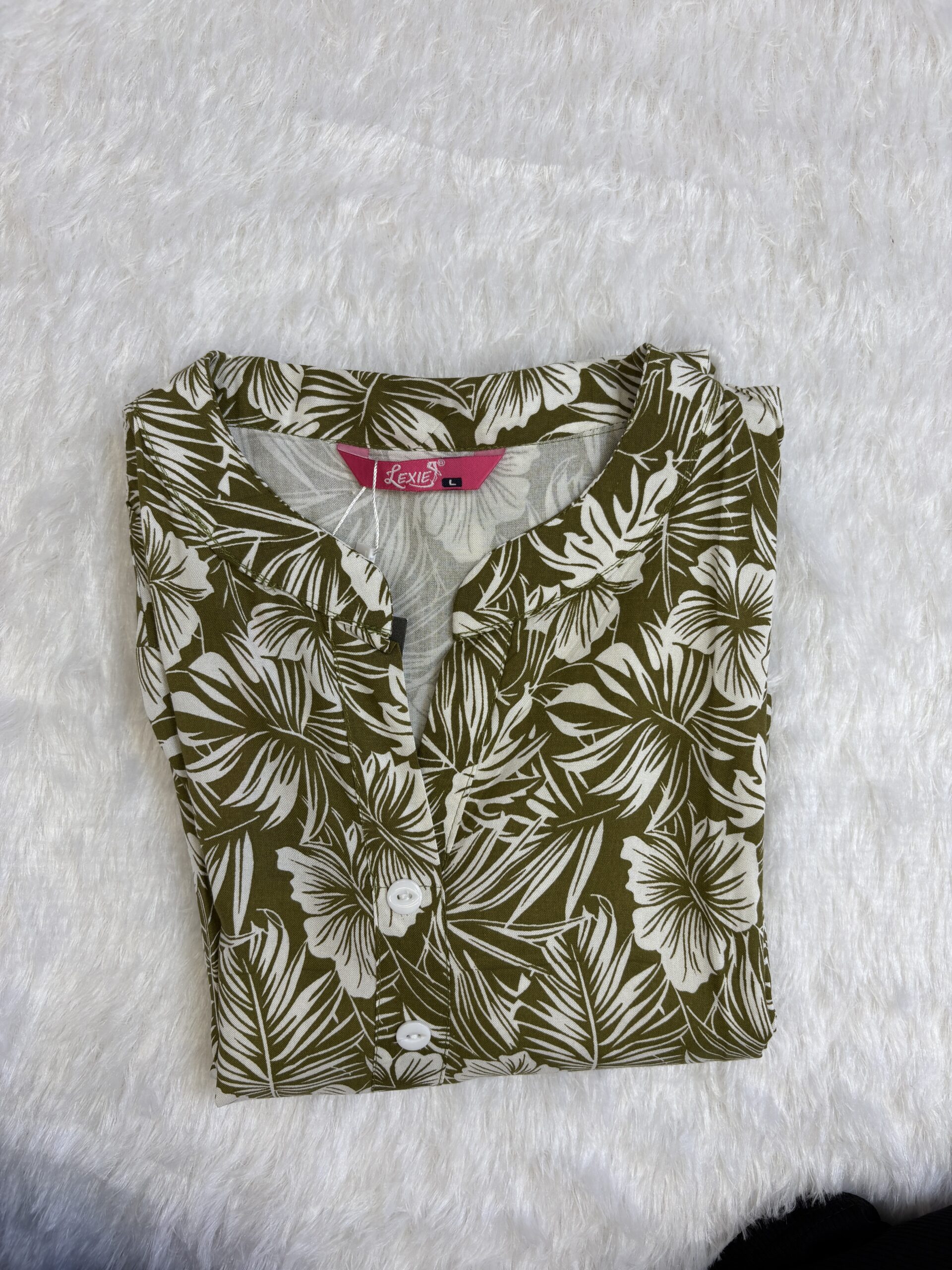 Refresh your everyday wardrobe with this elegant olive green floral printed cotton kurti from DivineDhaga. Designed for all-day comfort, the kurti features a soft breathable fabric and a straight-cut silhouette that flatters every body shape. The minimal button-down neckline and all-over cream floral print add a graceful touch to your daily look. Perfect for office wear, travelling, casual outings or relaxed festive days — it blends comfort with timeless everyday style. Pair it with leggings, pants or denim for a versatile contemporary styling.