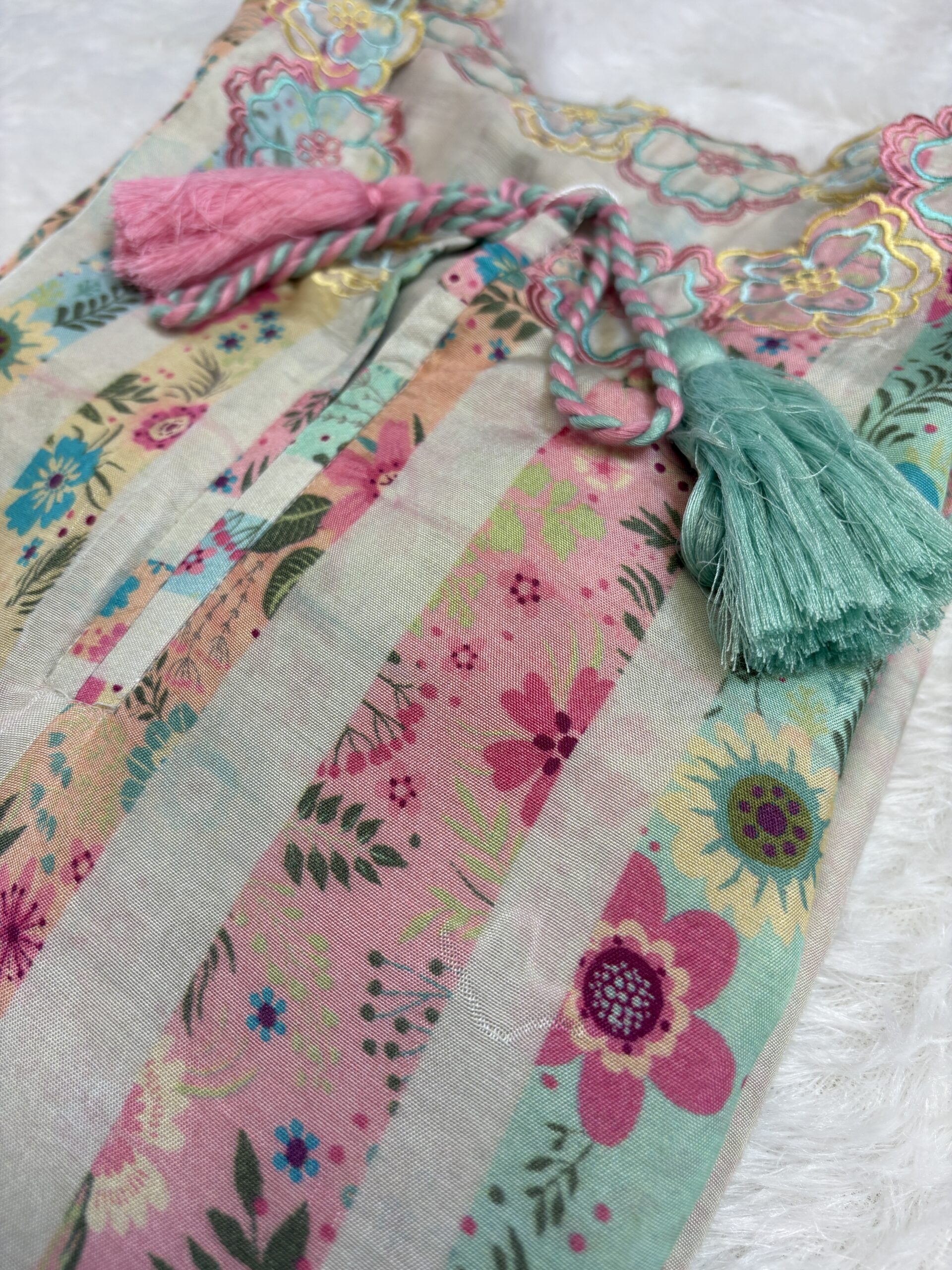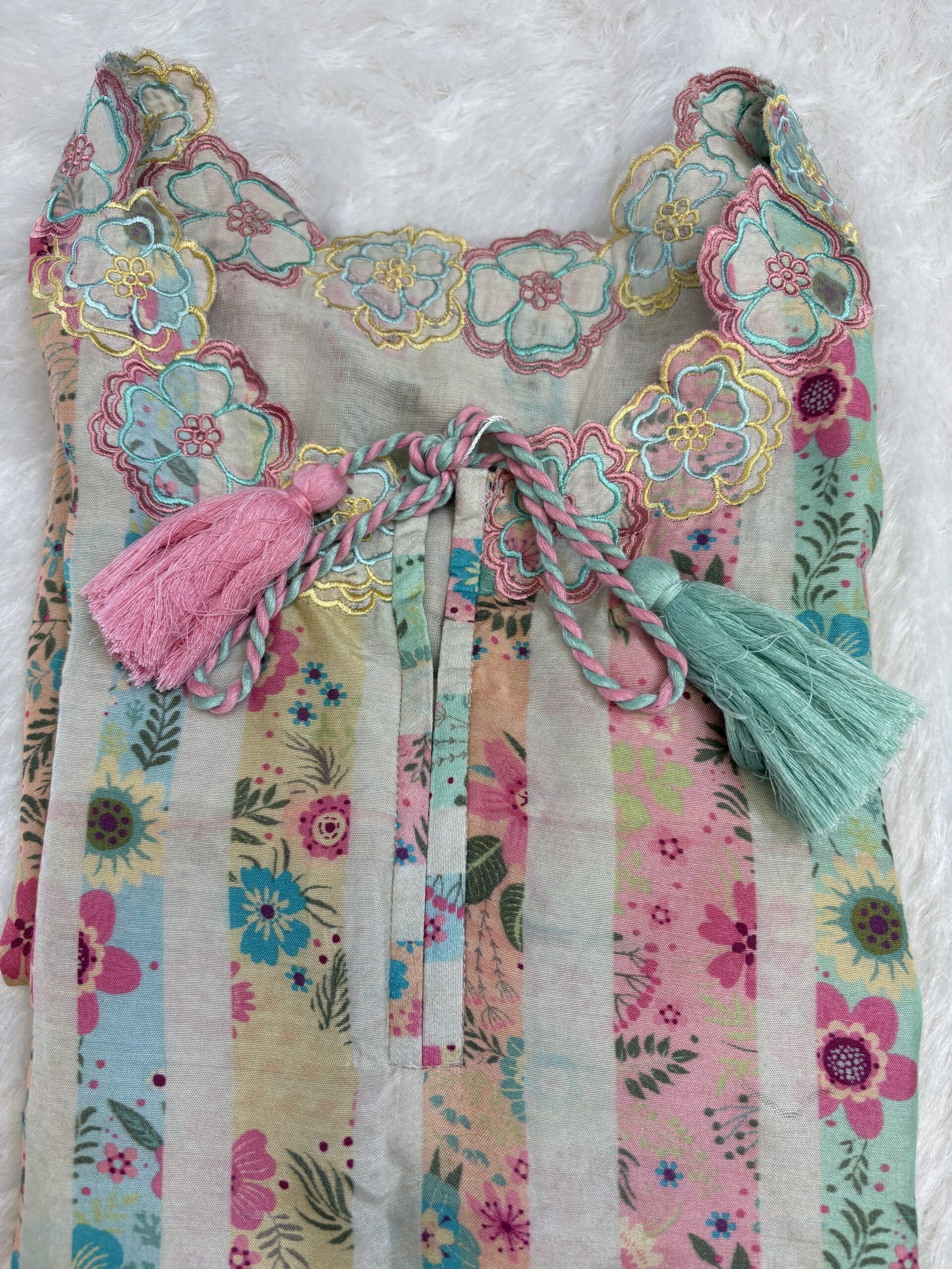 Bring home a refreshing burst of colour with this pastel floral striped kurti, crafted from soft, breathable cotton for all-day comfort. The neckline is beautifully highlighted with delicate multicolour floral lace and playful dual tassels that add a charming boho touch.